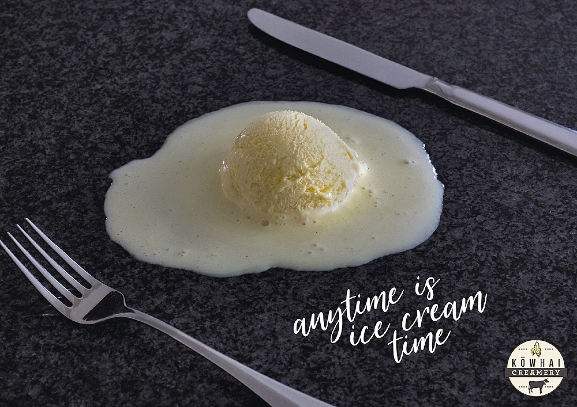 El avisador es la heladería Kōwhai Creamery, ubicada en la localidad de Waharoa, región de Waikato, Nueva Zelanda, y el aviso fue realizado por la agencia Adam Barton Creative, basada en Sydney. Adam Barton es un fotógrafo y creativo neozelandés que en este caso se encargó de concebir la idea, tomar la fotografía y oficiar de director de arte y redactor a la vez. Para ello contó con la ayuda de uno de sus directores de arte, Alice Ewen, y del retocador digital Chip Fontaine.